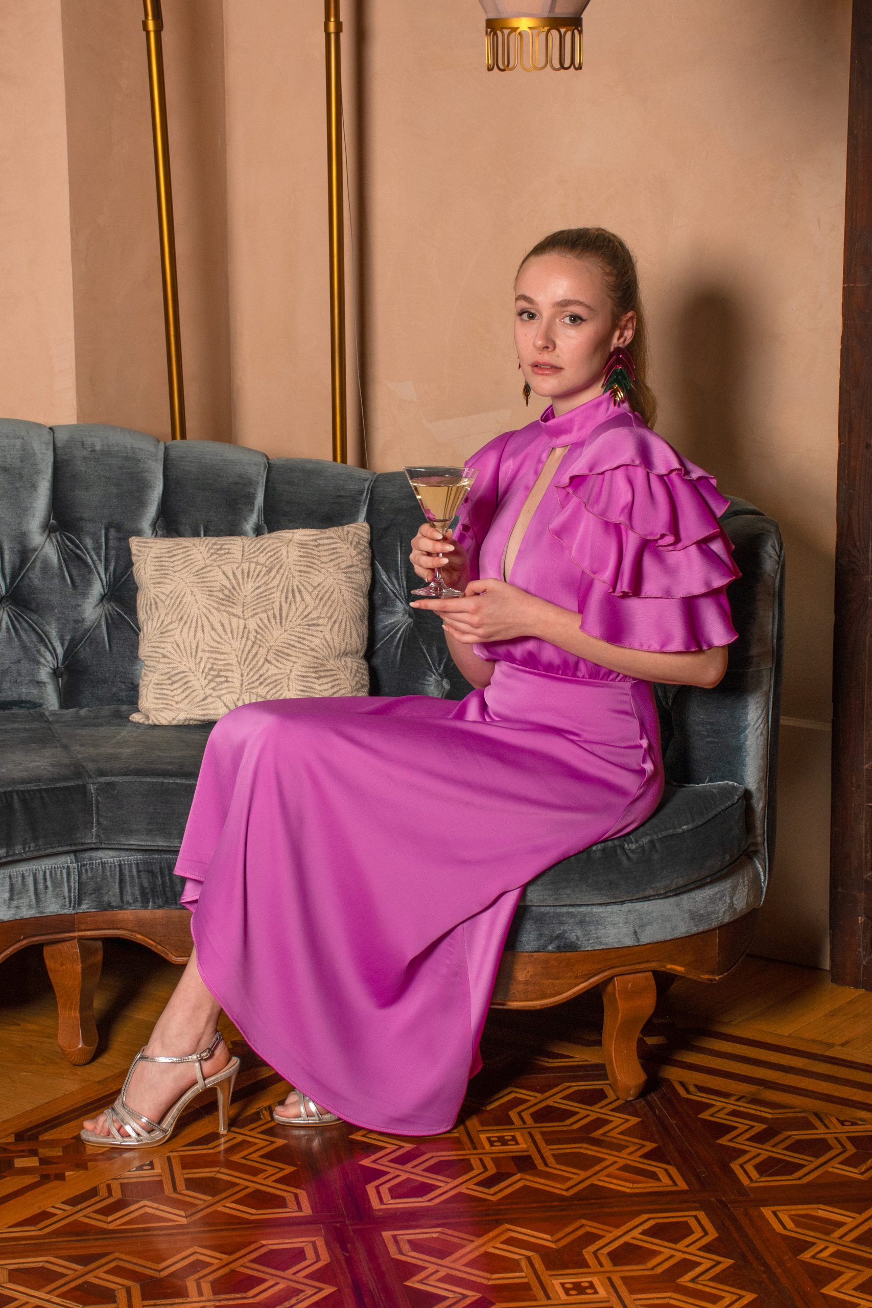 Vestido Bambula Satinado, Mangas Con Volantes Y Cuello Halter.